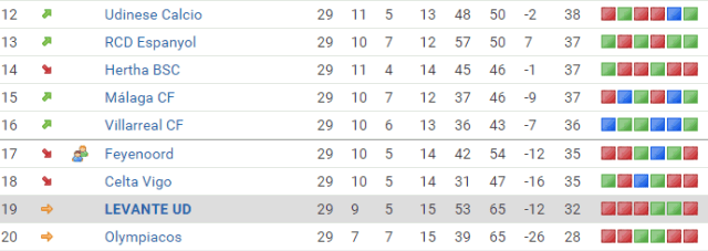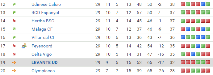 Levante’s next three games see them take on Feyenoord on Thursday, Celta Vigo next weekend, and then Villarreal. Parfitt knows that his side cannot afford to lose any of the games, and really need a minimum of 7 points from the three fixtures to give any kind of realistic hope for the run in. However, with Malaga and Hertha to play as well, the club know that they still have their destiny on their own hands. Levante have also lost 12 points from leading positions so far this season, which would have seen them in the play off places had they shown a little more defensive character.