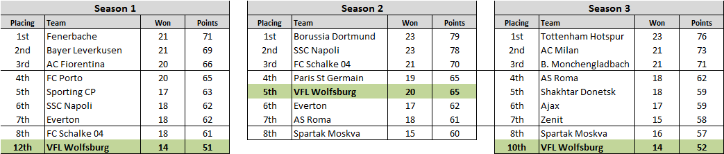 Taking the view from Mr Malcolm – in his excellent statistical analysis – has put Wolfsburg at 7th in Season 2, and 14th in Season 3 (I couldn’t find the analysis for Season 1). So the team has managed to improve +2 and +4 on these predictions in the past. For Season 4 his prediction is for Wolfsburg to be back up to 7th – presumably based on the overall improvements in the squad with the addition of Gotze, Fabregas and Toure – so certainly a Top 5 finish is not out of the question.