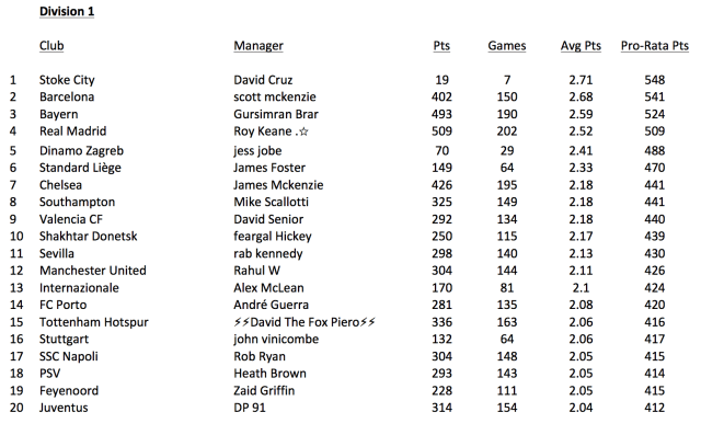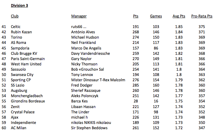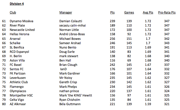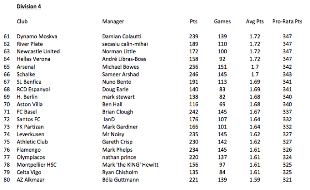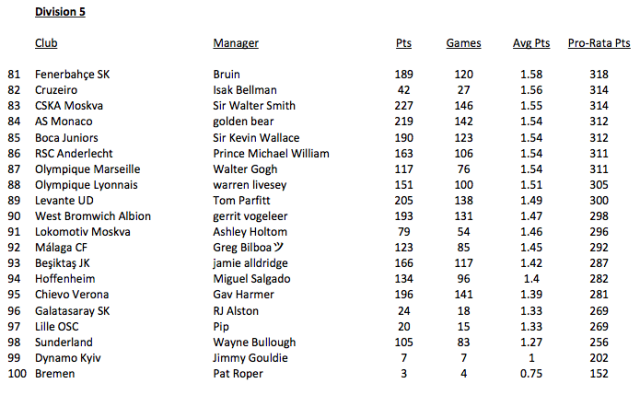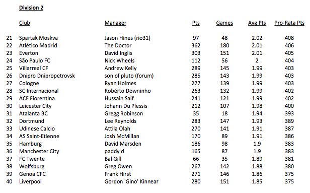 From this I then tabulated the revised ratings and split them into divisions, top 20 managers being Division 1, etc.