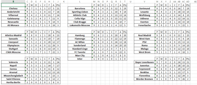 Group C: Group won outright by Valencia and Napoli will finish second – both sides though have interesting final day showdowns with Genoa and Arsenal with Genoa currently two points ahead of Arsenal but Genoa without doubt have the more difficult final day fixture.