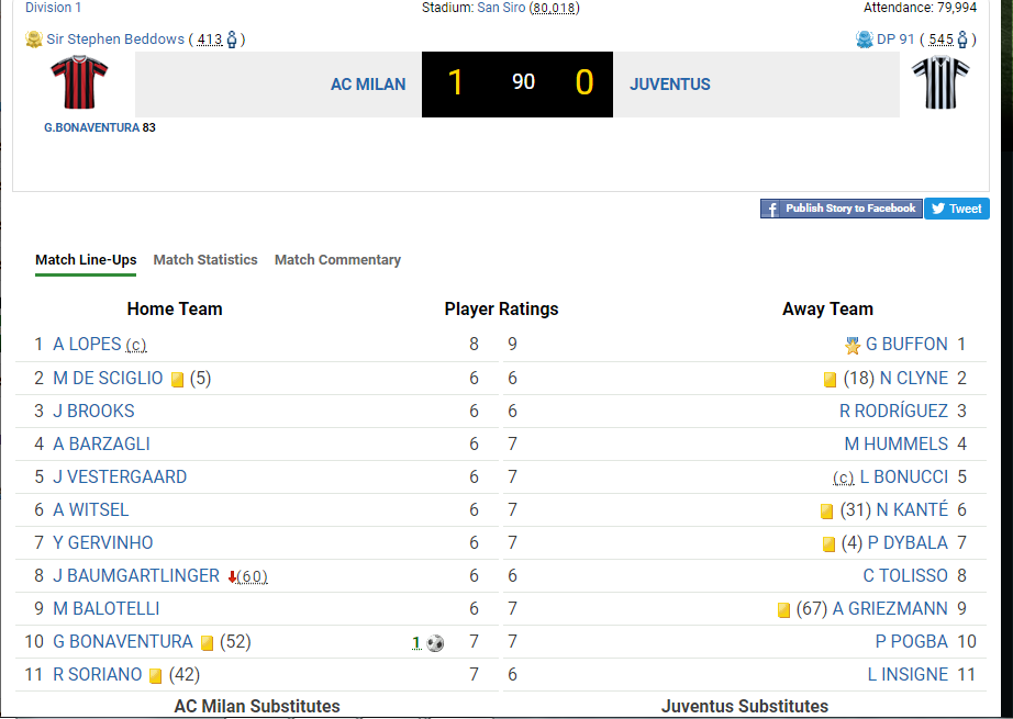 Tonight Milan were superb from the off, Balotelli and Gervinho (on his debut) were excellent, Juventus and Mr DP could not cope, Mr Buffon kept Balotelli and Co at bay but it was not to be… a masterful tactical change on 60 minutes from Beddows saw Deulofeu enter the fray – Bonadventura moving back to sit in a two in the middle and BOOM… the two combine for Bonadventura to score a stunning goal to snatch all 3 points for Milan as they move up the table!