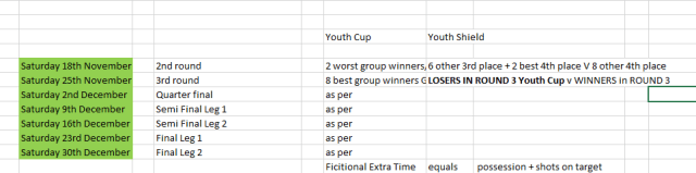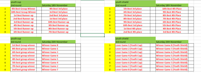 Top 4 in each group go through to knock outs. Top 8 group winners get a bye and home tie in Youth Cup 3rd Round… Best 4 3rd places progress to Youth Cup.