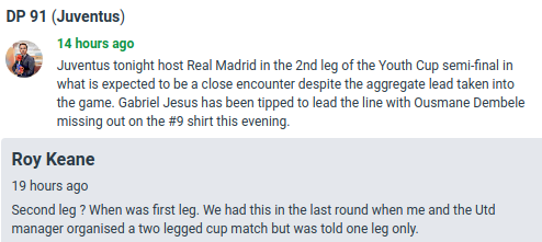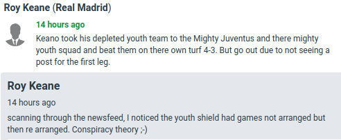 Madrid manager Keane blamed everyone but himself for the mix-up, including claiming he had never failed to arrange a home fixture in six seasons (apart from two this season), that Juventus’s team were better than his (he should know, I suppose, as he sold his best youth players to his Italian rivals), and and even claimed it was a conspiracy against him as Youth Shield games were rearranged (after the managers involved notified the Youth Cup organisers before the scheduled match days that the games couldn’t be played, not a week after).