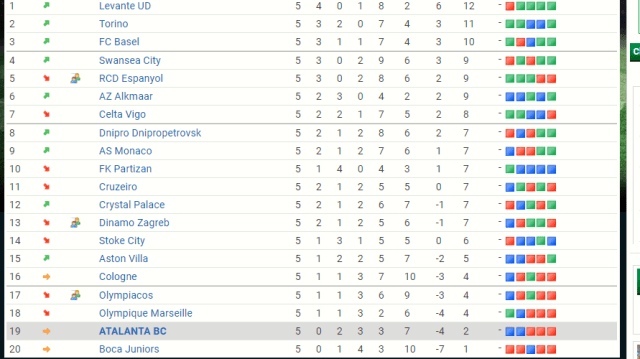 Levante hit top spot with Torino and Basel following. Villa move out the relegation zone after their first win of the season. Boca and Atalanta continue their poor start to the season.