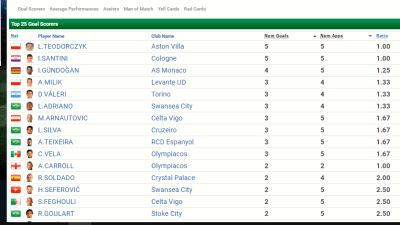 Teodorczyk and Santini leading with 5 goals in 5 games.