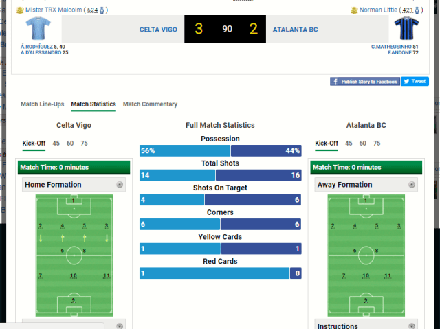 Atalanta got their T100 cup campaign off and running and it will be no surprise to anyone when I say we lost. A much changed side were given the run around in the first half away to fellow Division 4 side and were 3-0 at HT despite Ndiaye seeing red for the home side on 34. The 2nd half was a bit of an improvement against 10 men and goals from Matheusinho and Andone give some sort of hope but the 10 men of Vigo finished the game stronger despite their numerical disadvantage. 3-2 win for Vigo and Atalanta can look forward to increased pressure from their suffering fans.