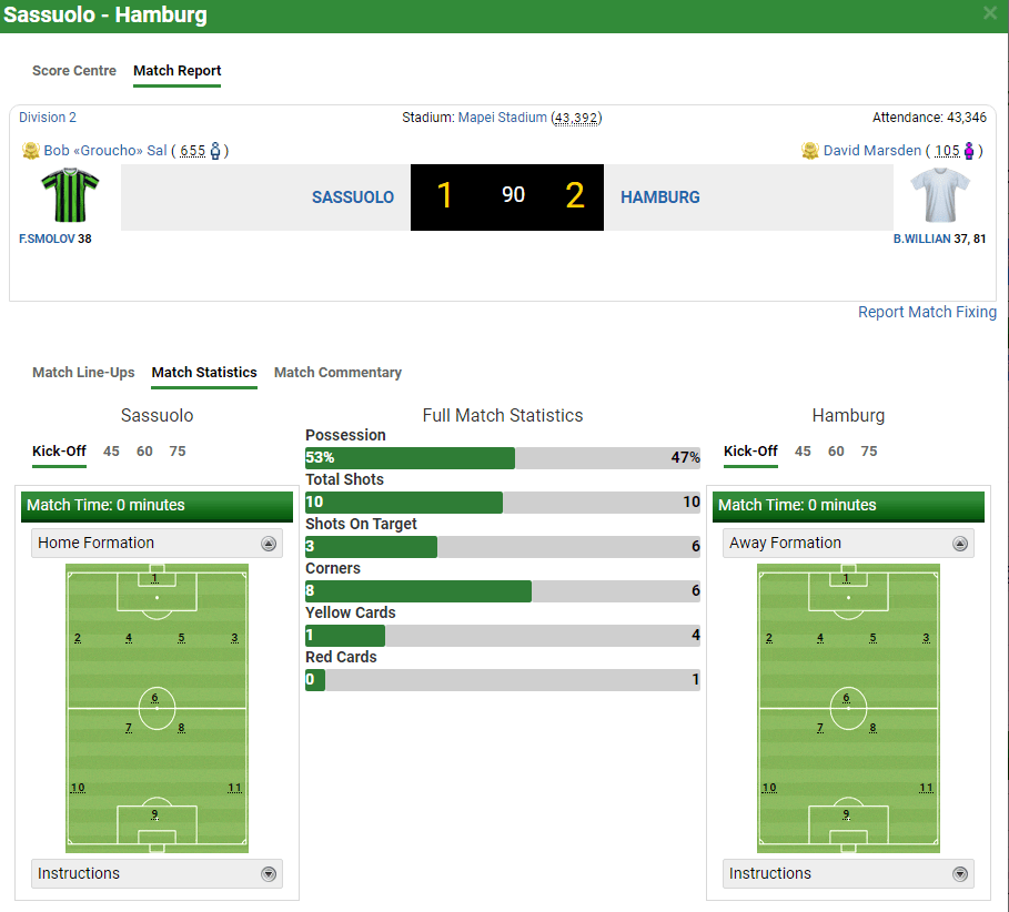 Table toppers Sassuolo were looking to put an end to 4 successive draws when Hamburg rolled into town, themselves on the back of 2 successive defeats. The match started in great fashion with both sides looking to start on the front front. Smolov for the hosts and Gabbiadini for Hamburg both twice denied goals in the first 12 minutes as the game flowed from one end to the other. The visitors started to take control with Willian dictating play. The Brazilian had already passed up a few chances before on 37 minutes he broke the deadlock, Meza creating the opportunity before Willian struck a low effort beyond the outstretched dive of Consigli, 0-1. The lead lasted less than a minute as straight from kick off Sassuolo responded, Pedro went down the right flank before crossing for Smolov who smashed a half volley into the top corner, 1-1 and it stayed that way till HT. The second half started slow, a couple of efforts off target from both before Hamburg were reduced to 10 men in the 69th minute, Stepanenko lunged into Marchisio with a dangerous challenge, catching Marchisio just above the knee, and there was no question what colour card was coming. The red card actually galvanised Hamburg and on 81 minutes that man Willian was at it again, receiving Gabbiadini’s lay off he struck a fantastic curling effort into the top corner from the edge of the box, 1-2. Sassuolo were unable to mount any fightback and Hamburg leave with the 3 points, Sassuolo lose top spot as their winless run extends to 5 games.