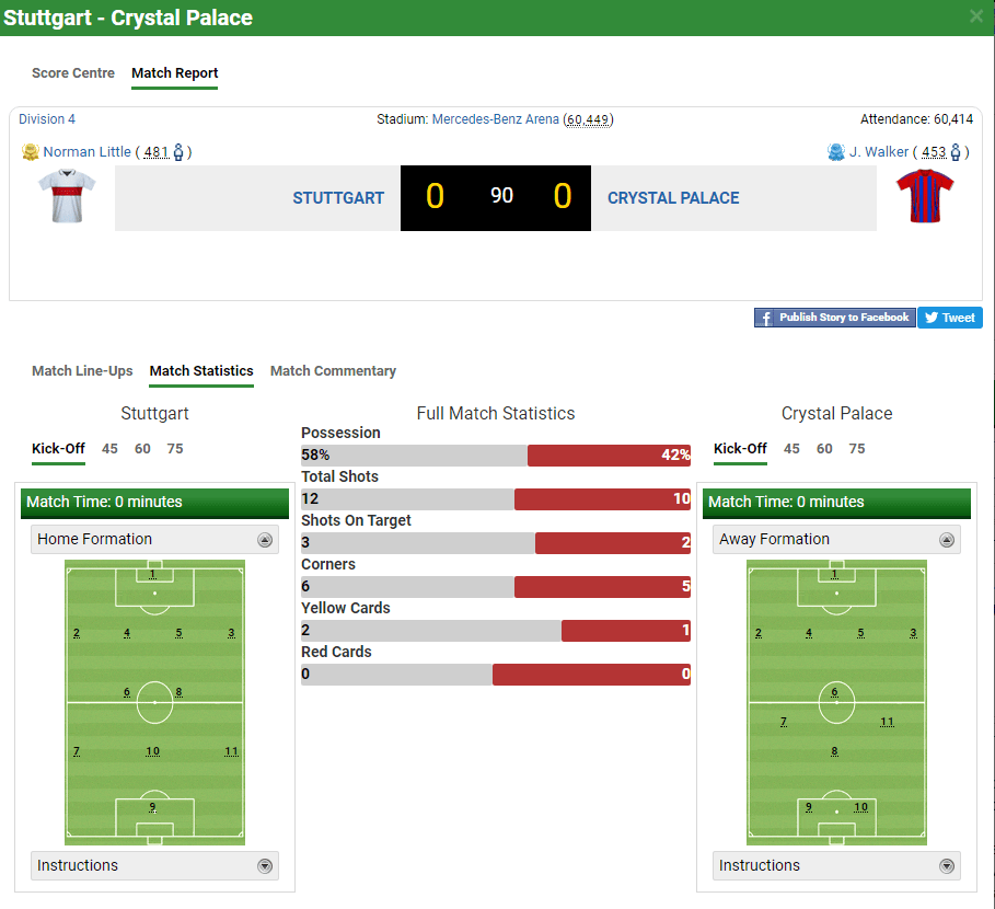 Stuttgart welcomed Palace in this Division 4 encounter looking for their 4th successive win, Palace with 1 win in their last 5 games. The game was a tactical affair, the best effort of the first half on 40 minutes when Cabaye curled a fantastic effort from 20 yards out which Asenjo went full length to tip it on to the post before quickly collecting at the 2nd attempt. HT 0-0. The second half followed the same pattern, shit for those watching, with the game springing into life on 67 minutes, Arao split the defence with a peach of a ball which Santini latched on to , took a touch before slotting past the keeper however celebrations were cut short by a snide offside flag. Crystal Palace’s best effort almost won the game for them, 76 minutes in when a deep cross was nodded down by Babacar to Sansone who smashed it towards goal, it looked destined to burst the net before Pope showed all his reflexes to get a hand to it, Divine intervention from Pope. That was it basically for the game, bored me to death watching it and I’m feeling the pain writing about it. 0-0 FT. Stuttgart stay 4th, Palace remain 10th. Thank Christ that is over with.