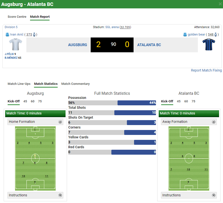Finally we get to Division 5 as Augsburg looking to continue making moves towards promotion entertain Atalanta who have suffered 3 straight defeats after being top themselves only a few weeks back. Ivan Anic’s side took just 9 minutes to take the lead when Ramirez played a high ball over the static Atalanta defence which wionderkid Felix met with a delightful lobbed effort which dipped over the stranded keeper and went in off the post, unbelievable finish, 1-0. The visitors were almost level when Guendouzi fed a wonderful ball through to Cornet who struck the ball first time but unfortunately the well struck effort was straight at Masip in the home goal. HT 1-1. Guendouzi provided Unal with another great opportunity in the early stages of the second half, the striker flashing in an effort at the near post which the keeper got down well to save. on 59 the Italians were so close to levelling, Cornet feeding Theo Hernandez who hit a low drive which had Masip beaten before it smashed against the outside of the post. On 65 minutes the hosts went 2-0 up as Ramirez again providing the assist, this time linking up with Mendez who’s quick shot caught out Berisha who was unable to get down to it in time and the ball sneaked past him, 2-0. That knocked the stuffing out of the visitors as Felix, Jordan and Esgaio threatened to make it a more convincing scoreline. FT 2-0 and Augsburg are up to 2nd as Atalanta drop to 7th after their 4th straight defeat.