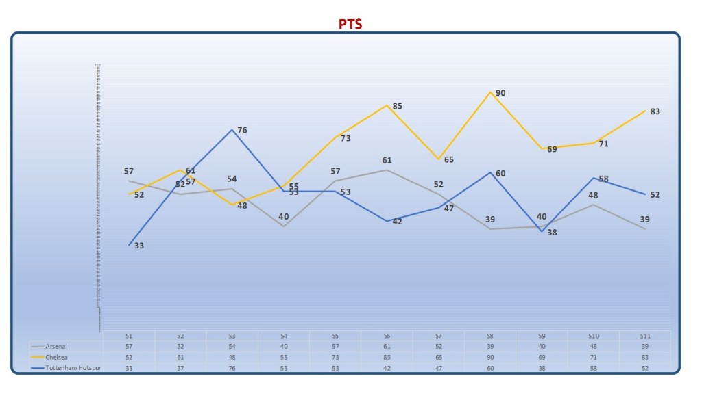 The other two charts permit you to select some data. The first (Final League Pos), where you can select three teams and it will plot their final league positions across the eleven seasons. The second chart (All), allows you, for three teams, to plot Wins, Losses, Draws, Goals For, Goals Against, Goal Diff. and Points earned.