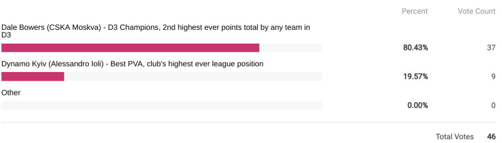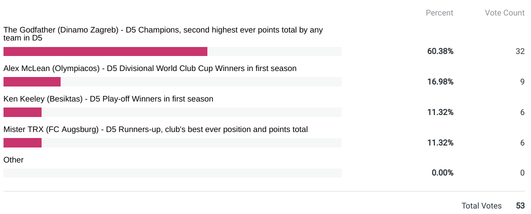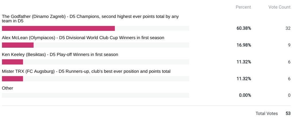 I want to say thank you to all previous Dinamo managers. Also thanks to all who decide to give me a vote and decide me to be D5 manager of the season. Will continue hard next season to make best possible result. Really happy with this team and opportunity to be their manager. Wish all the best to all managers in new season.