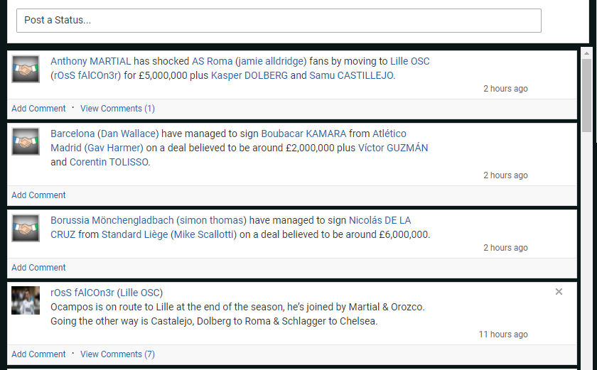 1. The historic staple of any Gameworld is its newsfeed – we actively encourage managers to post scores / advertise players. Commenting on each others posts encourages community and activity. ALL 100 members of the gameworld can access this.