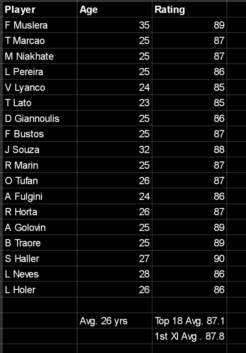 The first team average rating has increased from between 85/86 to 87/88, a big difference in the starting 11 in relation to being able to compete with other teams. Just as importantly this includes 5 players rated between 88 and 90, a huge improvement on our best player formerly being 87 (and over 30 years old). It’s almost 100% factual that the higher rated players perform better and provide match winning contributions, and players like Haller, Traoré and Golovin certainly give Cruzeiro a better chance. This group of players is almost fully consists of players that are not yet passed or reached their peak, with a couple of experienced veterans thrown in for rating balance. In most of the team there is still room for rating growth.