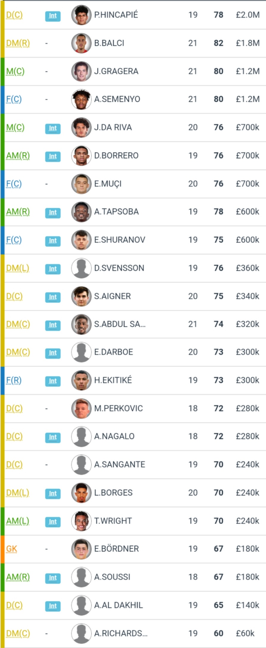 Whilst Robérto has done his very best to build a first team with solidity and longevity, the same dedication has been given the the youth team and young players. Belief that there’s always hidden gems out there in the external market makes the manager resilient in his quest to unearth them. In plenty of countries and divisions can you find a young player gathering good gametime, take the gamble on them, then time will tell. An ordinary example of which is Piero Hincapie, signed cheaply from Talleres at the beginning of the year, became an undisputed starter for club, then made his international bow. Subsequently he’s put in stellar performances for Ecuador in the Copa America, and is now highly sought-after both in real life and in Top100… (can’t go a day without getting a bid or a counter for him!) There may well be more like this in the youth team, that will either become valuable assets for the future or trade bait.