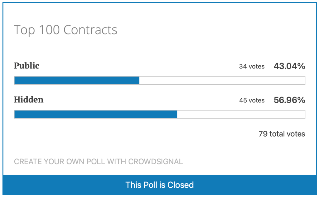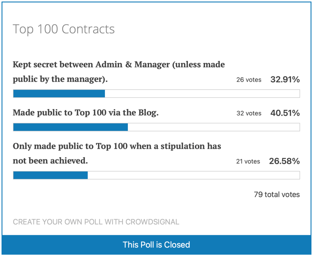 An overall vote of 32 totalling for the Contracts being made public here, a 2 vote difference from the 34 that voted for the option of Public versus Hidden in the first poll. In regards to the more Hidden options but potentially being made visible, a split between being made public when a stipulation has not been achieved & being kept totally secret, with the latter being the slight winner between the two.