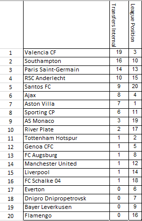So the big question is does transfer activity = success ? We ranked the sides by the number of internal deals and then put their final league positions next to them? The result?