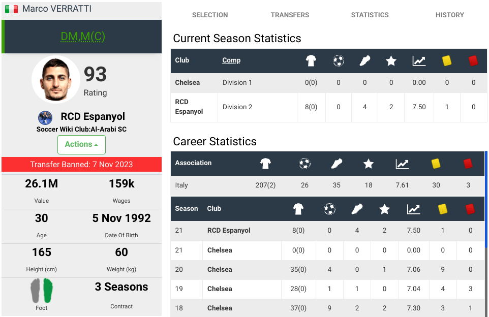I play my first team strategy at Espanyol season by season, to allow my younger players to grow into the first team. Each season I’m on the look out for some short term fixes who can do a job for a season or two who can aid winning football matches.
