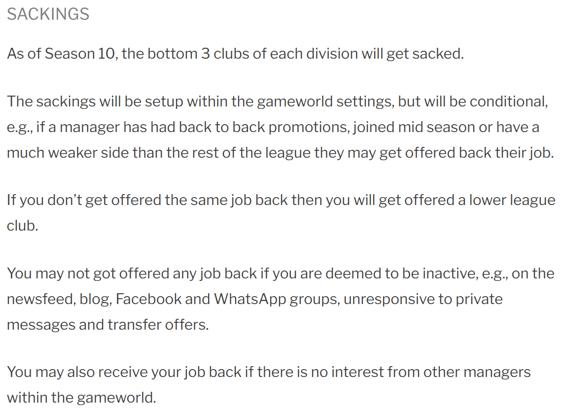 Two things I would say about this seasons sackings – we’ve had quite a few managerial changes during the season already, and not many managers waiting or ready to join now from Top 120 or elsewhere, so don’t expect a bloodbath. And as this is a new way of doing it (even if it’s based on the rules that have been there since the beginning), I think it’s only fair to go a little easier on managers this time around. Next season could be different!