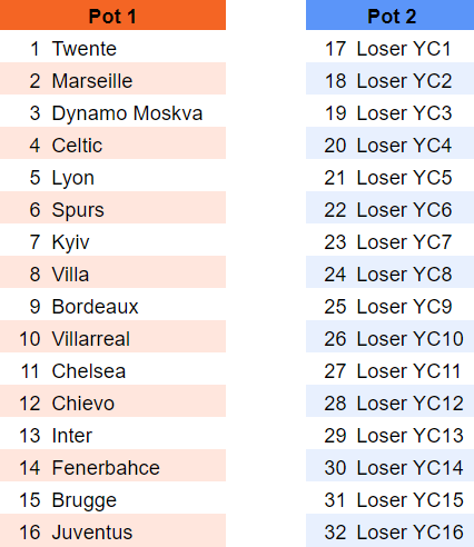 For the purposes of the draw for the first one leg knockout round, I decided to keep things simple and have two pots as follows.