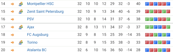 For my money, Atalanta and Torino will be joined by Zenit in the bottom three, and I think Augsburg may just fail to catch Montpellier for the final relegation spot.