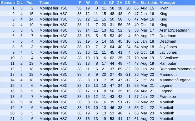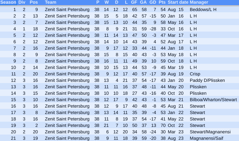 Zenit are traditionally the club no one wants, even having three managers in one season (S10)! Their D1 heyday under current Torino boss L H’s stewardship are a distant memory, although they had a revival under Mark Stewart who took them back to D2 as recently as S19.