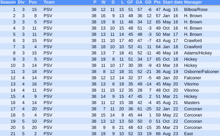 PSV are another club with quite a turnover of managers, and until S18 had never dropped into D5. Padraig Corcoran’s disastrous four seasons in charge saw them fall to the foot of D5. Manager Chris East transformed the club’s performances securing promotion in his first season against the odds. Can they do enough to survive their first season back?