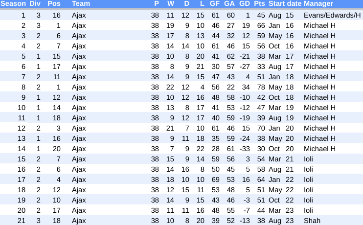 Their first season aside, Ajax have had management stability with just two managers prior to Shah. It’s certainly arguable with hindsight that the club acted hastily in dismissing two long-serving managers, neither of whom wanted to leave.