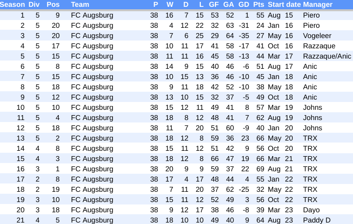 Augsburg came close to promotion last season, so it’s been something of a surprise to see them struggling all season this time. Manager Paddy D jumped ship during the season, and new boss Anmol Satam has struggled to turn things around. They’re unbeaten in the last four, however, so that’s certainly cause for hope.