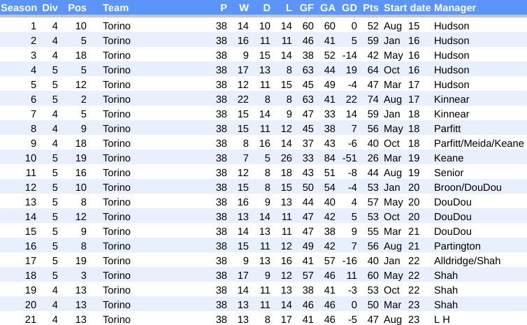 Former Zenit boss L H’s Torino have a mountain to climb. This is their fourth season in D4 which is already a record for the most seasons outside of D5.