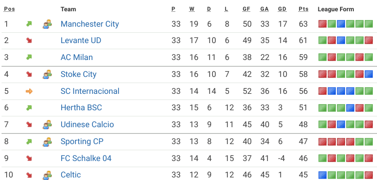 With 65 points needed to be “certain” of promotion in the top three, Manchester City are as good as there, Levante look set to follow them, and the final automatic place will be between Milan, Stoke and Internacional.