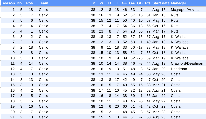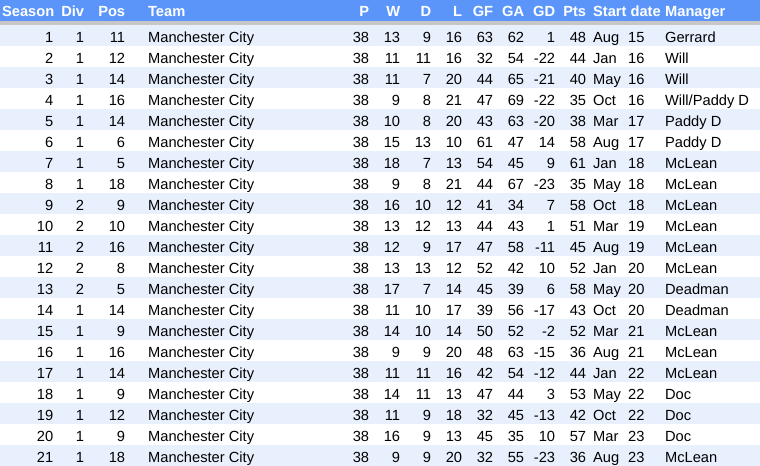 A rebuild and relegation followed, but it was Mark Deadman who took them back to D1 in S13. City enjoyed eight seasons in D1 under Deadman and Doc (aka Jamie H), until McLean return for a third time and relegated them in his first season back at the helm.
