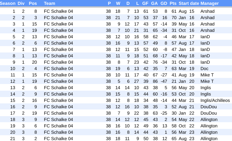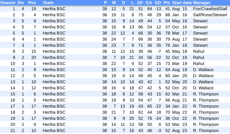 Hertha’s history shows steady evolution from a D5 side to D1 under three progressive managers, Mark Stewart (three consecutive division titles), Rahul (D3 title), and Dan W (promotion to D1).
