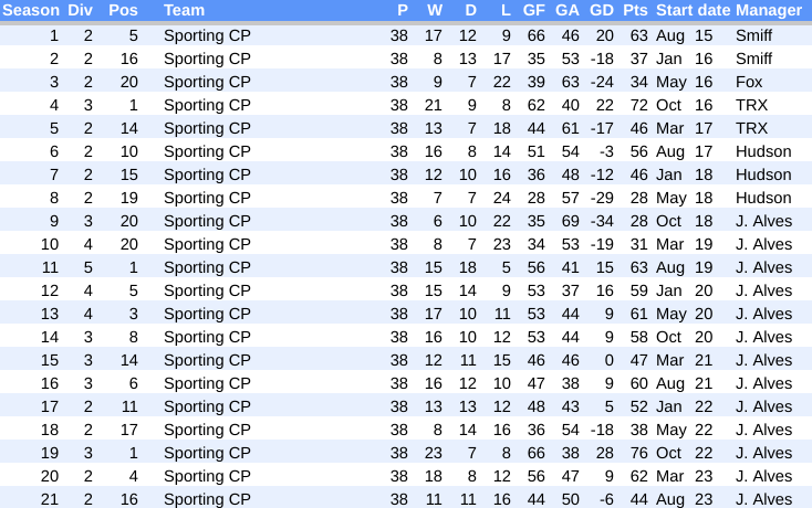 Sporting had their best ever season in S20 when they finished 4th in D2, although last season they narrowly avoided relegation.