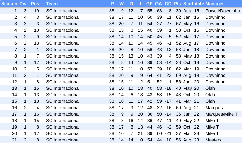 Internacional have won the D2 title twice before under former boss Roberto Downinho (now at Cruzeiro) in S7 and S11. They also won the D2 playoffs in S16 under Nuno Marques just before I drove him crazy.
