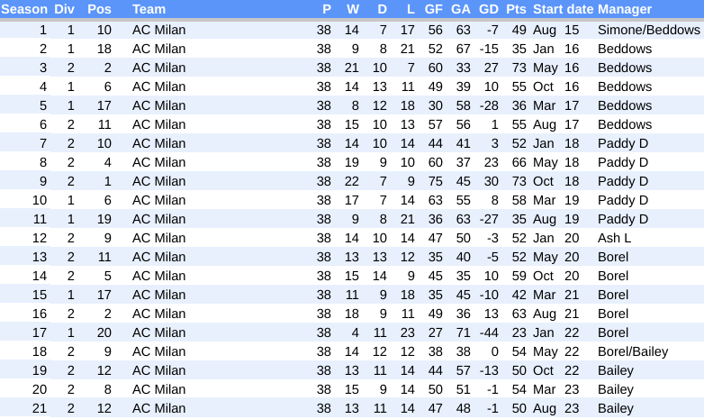 Milan look set for their best finish under manager Andrew Bailey, building on a series of impressive cup wins in the previous two seasons. They’ve been promoted from D2 on four previous occasions – in S3 (Beddows), S9 (title under Paddy D), and S14 and S16 (including a playoff final win under Alex Borel).