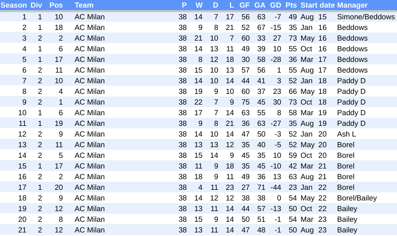 Although they’ve never managed to play more than two consecutive seasons in D1, this is Milan’s fifth consecutive season in D2, the longest they’ve spent out of the top flight in their history.
