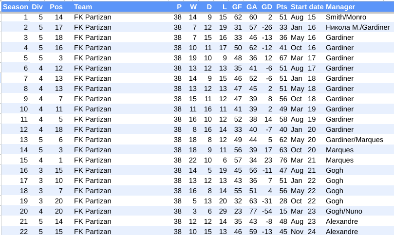 Mark Gardiner built a very good squad at Partizan many seasons ago taking them from D5 also rans to the D4 playoffs twice in nine seasons before it all went Pete Tong and they slipped back into the bottom division again. Gardiner’s successor Nuno “El Loco” Marques got them promoted in his first full season and won the D4 title in his second. He handed over to Top 100 legends Walter Gogh and Nuno “El Loco” Bento who combined to undo all Marques’s good work.