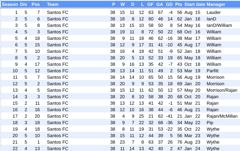 Lastly, but by no means least, Paolo Everland will aim to reclaim the heights of D2 achieved in the Morrison/Rajan era (three promotions in as many seasons), and avoid the McMillan/Pip/Wythe three successive relegations that soon followed. Dan Wythe won Santos their only title last season, and took them to 13th in D4 this time.
