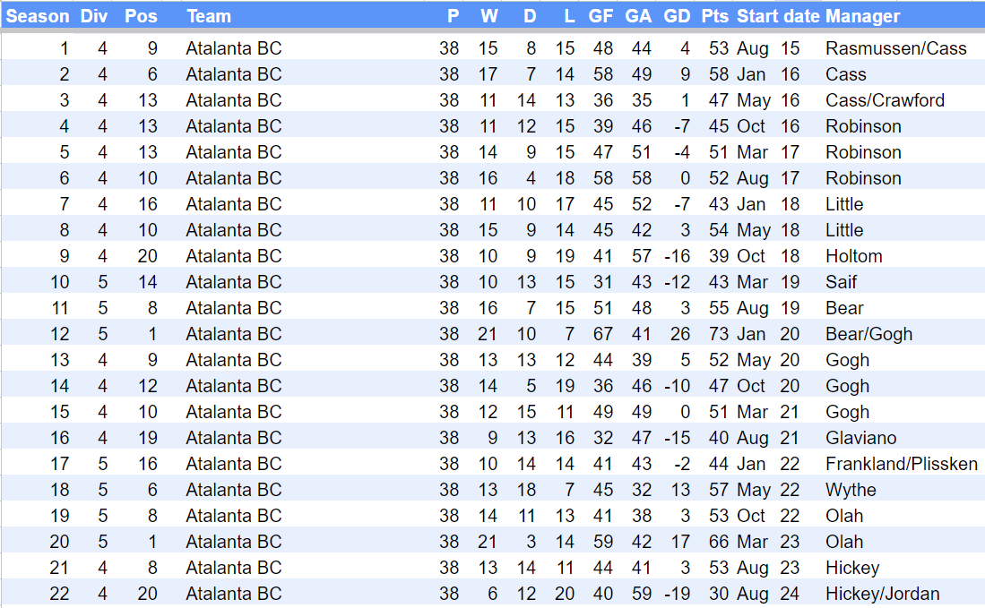 Chris Taylor has a big job on his hands at Atalanta. La Dea haven’t had the same manager for more than three full seasons. Their “glory” days were back in S12-13 under Golden Bear and Walter Gogh! A club crying out for some tender, loving care and nurturing over the longer term after a disastrous season finishing bottom of D4 as expected.