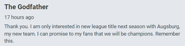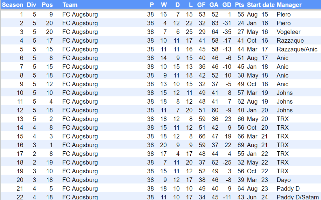 Augsburg were expected to win D4, but got relegated instead! Returning to Top 100, new manager The Godfather has already promised to lead them right back by winning the D5 title next season!