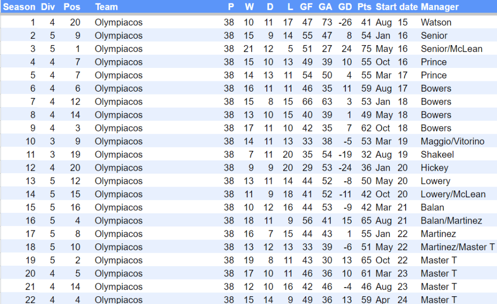 Speaking of masters, Master T masterminded a promotion and two playoff places in his four full seasons at Olympiacos. The club’s best ever period was arguably under the four season long reign of Bowers who built on the work of Top 100 legends McLean and Prince before him to lift the club into D3 for the only time in their history. Can Dhawy Al go one better than Master T and beat Bowers’ record?
