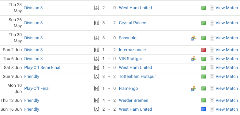 I decided to steal someone else’s set up from another game world. I’m not proud, but it brought about instant improvement with four straight wins including a 2-0 win at then high-flying Crystal Palace followed shortly after by a 2-1 win at “D1 team” Inter.
