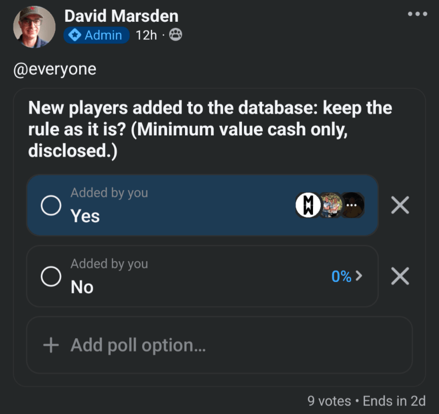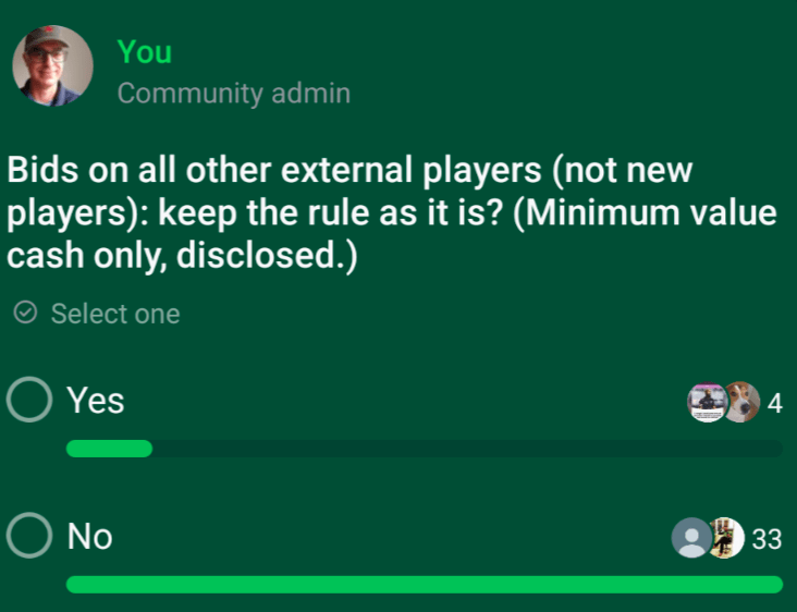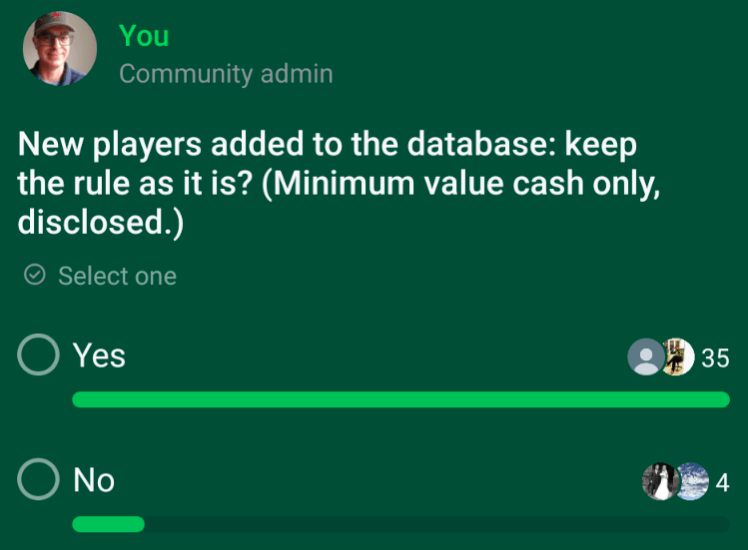 Last night I did a couple of polls on WhatsApp and Facebook to confirm what I thought we already knew: that we want to keep the new player rule, and change the temporary external player rule.