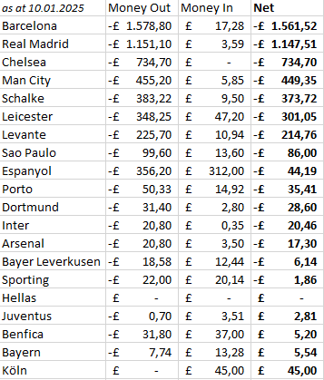 With a lot of debate in the GW lately, I present a quick and easy update regarding net transfer spend Div 1. In what I can only describe as eerily similar to real life, Barcelona is the biggest & most wreckless spender in the division. Closely followed by Real Madrid, Chelsea, and Man City… Sound familiar? Equally, the German sides are all extremely financially prudent, with the exception of Schalke – just like in real life.