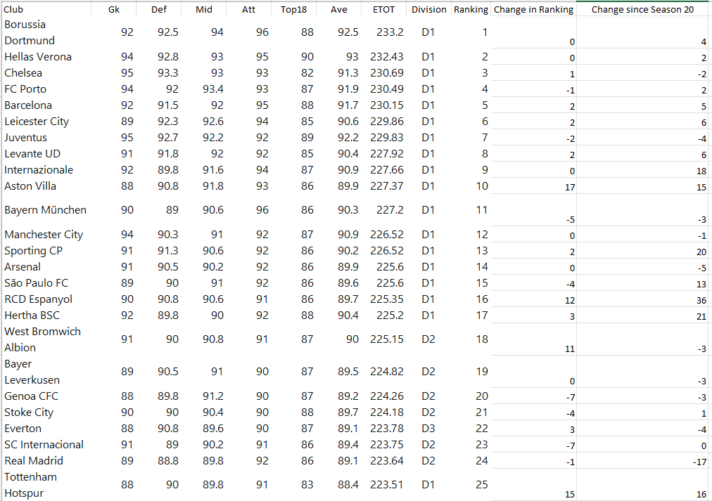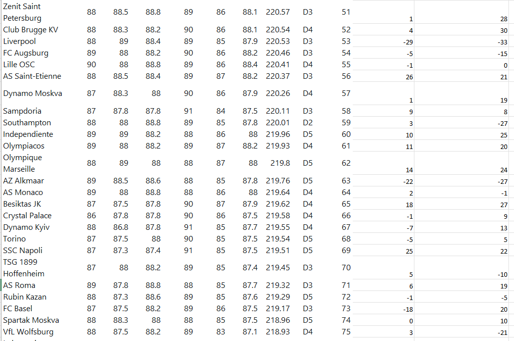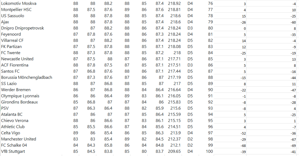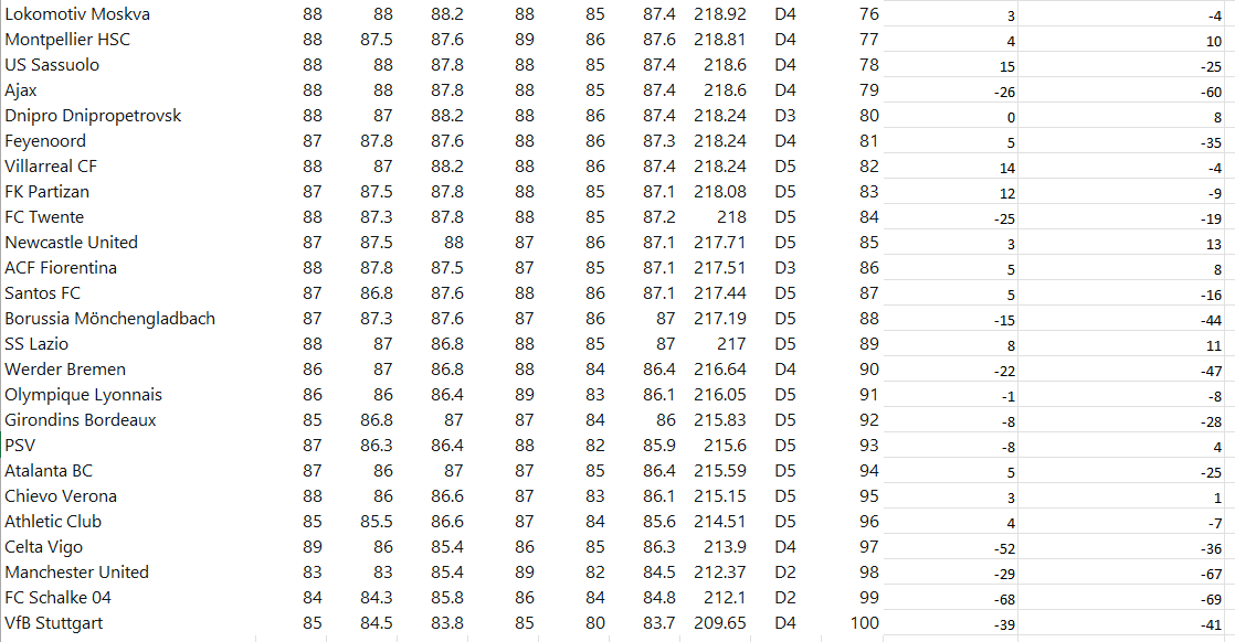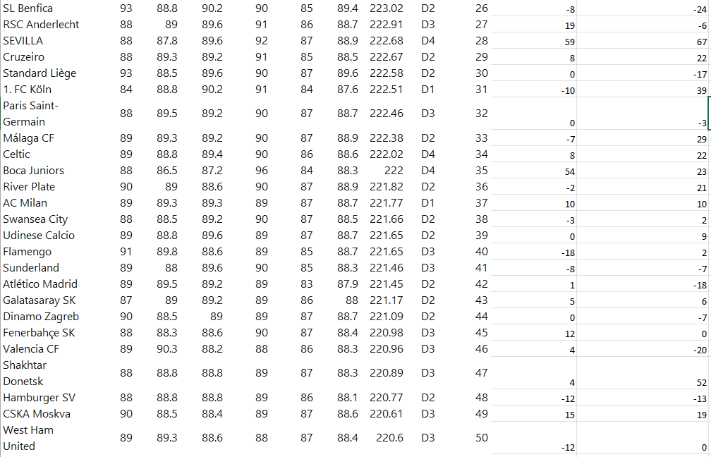 Sevilla, Boca, St. Etienne, and Napoli are the biggest risers from last season. Unsurprisingly, Schalke, Celta, Stuttgart, and Man U are the largest fallers from last season.