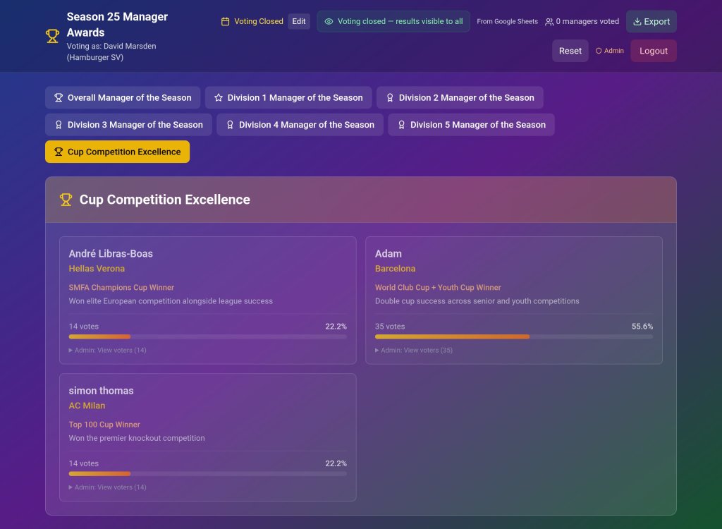The Cup Competition Excellence category delivered a thrilling three-way battle, with Adam’s multi-competition mastery ultimately prevailing with 55.6% of votes. His World Club Cup and Youth Cup double demonstrated exceptional squad depth and tactical versatility across multiple age groups.