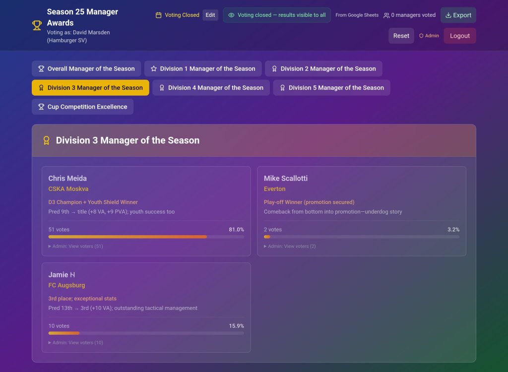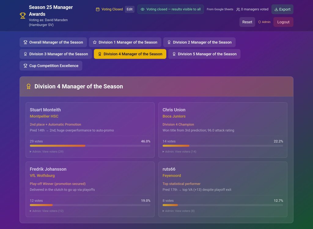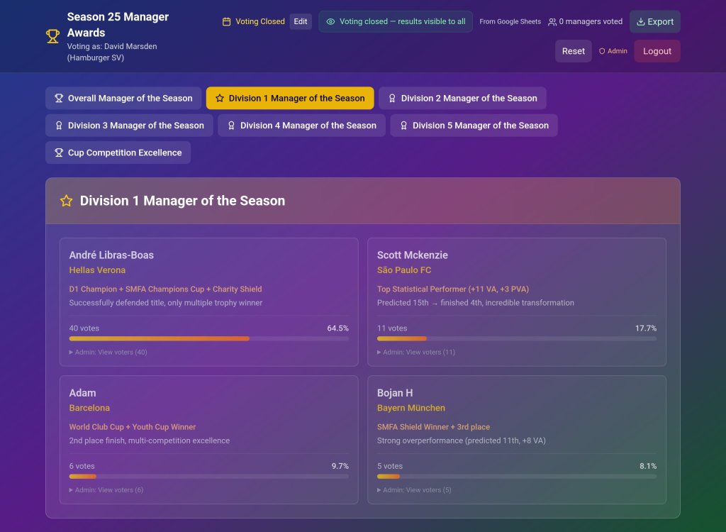 Libras-Boas swept to victory in the Overall category with a commanding 59% of the vote (36 from 61 cast), his treble haul of Division 1, SMFA Champions Cup, and Charity Shield proving decisive in what many considered the most competitive season in Top 100 history. The Portuguese tactician’s achievement in successfully defending his Division 1 crown whilst conquering Europe made him the standout candidate.