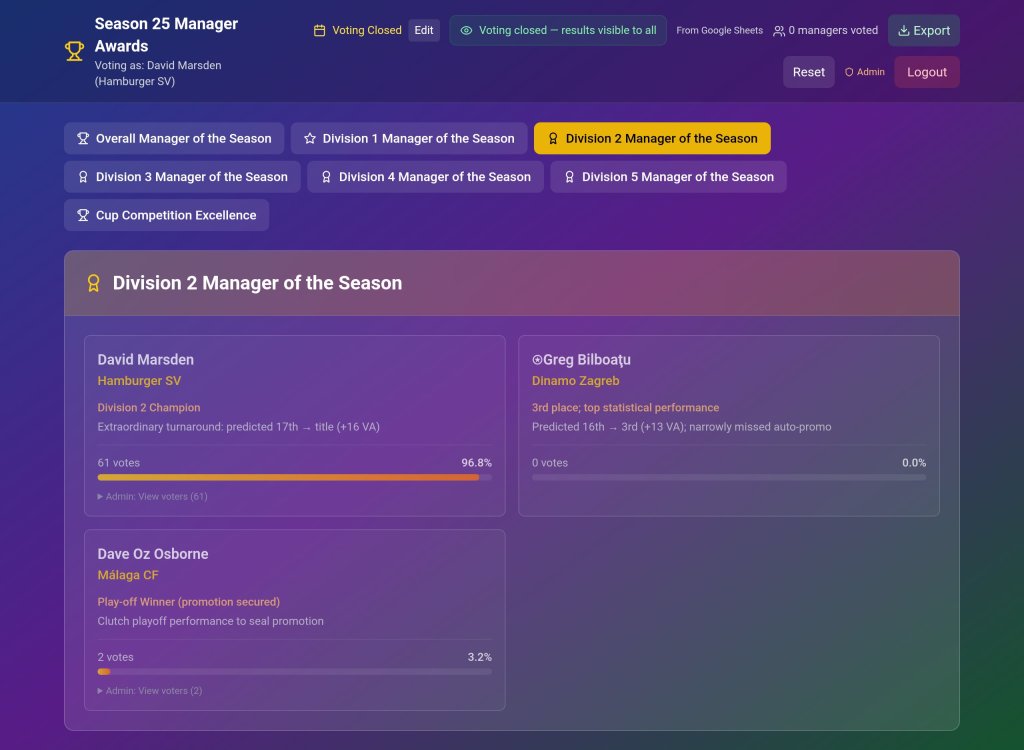 Delivered the most one-sided result of the night, with David Marsden claiming an extraordinary 96.8% of the vote (61 from 63). His championship triumph from such lowly expectations represented arguably the season’s greatest individual achievement, leaving Dave Oz Osborne’s play-off heroics with Málaga trailing with just 3.2%.