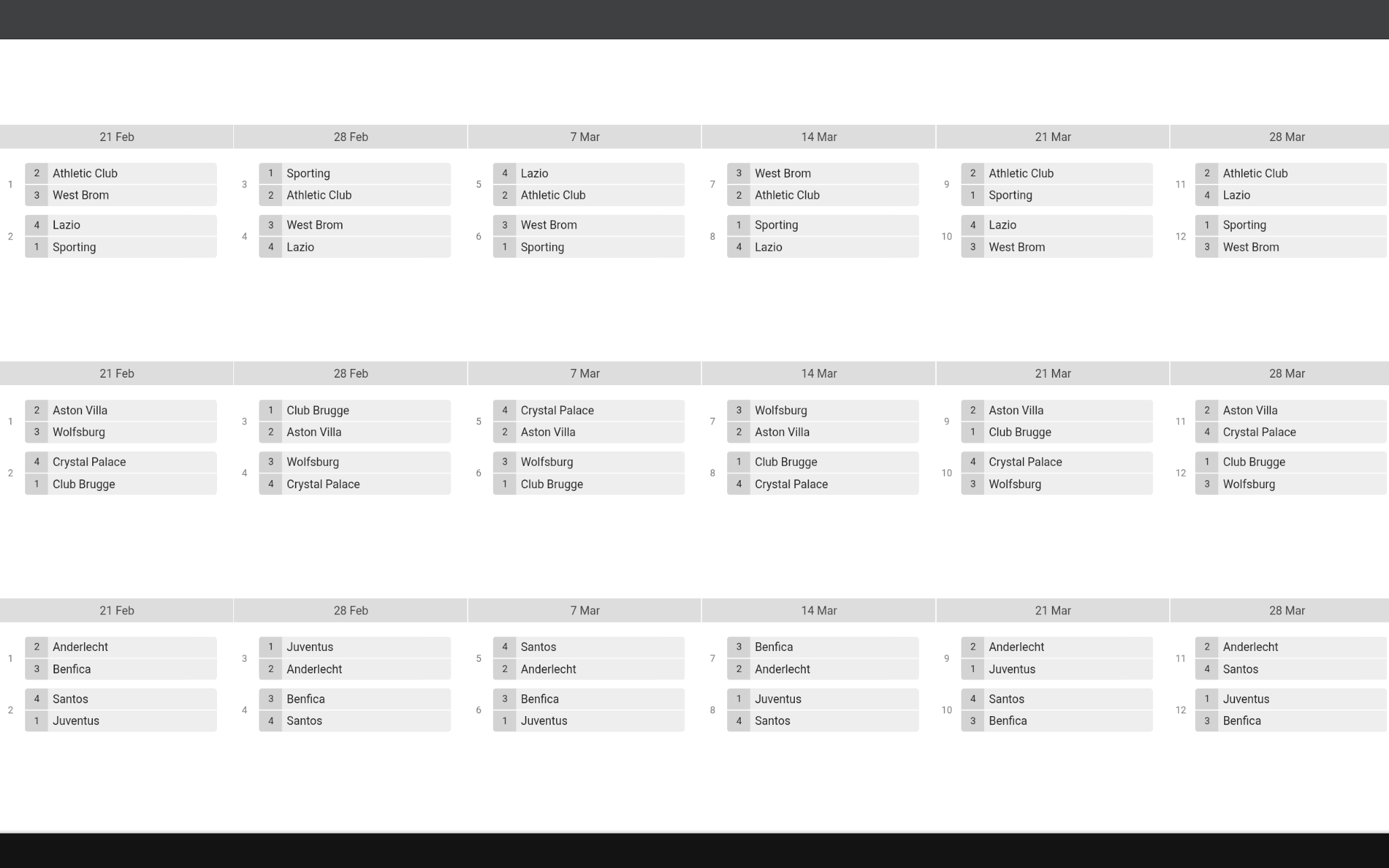 Managers who fail to arrange fixtures or select eligible players and teams will forfeit those matches 0-3, and be excluded from the end of season prize draw.
